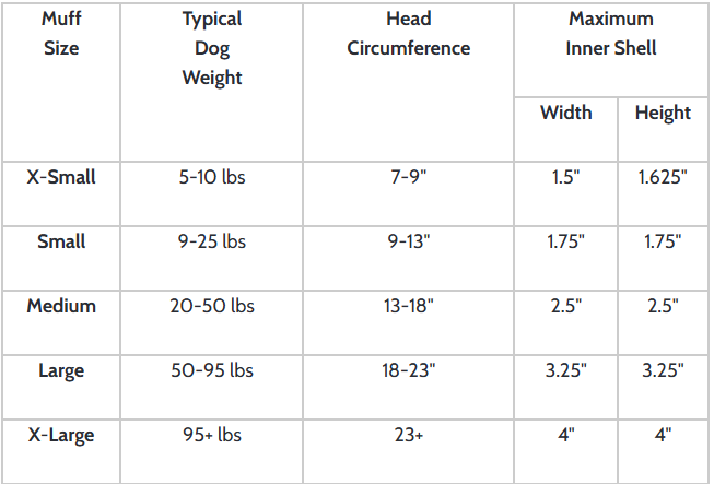 | The inner foam that we use is the exact same ester resin foam that is used in many high end commercial head sets designed for humans. Based on the materials used, the estimated decibel reduction is between 21 and 24, assuming proper fit and a good seal against your pup's head. That's 21-24 dB reduction in the human hearing range of 20,000 cycles per second, which is the only range that we have data for. Our canine friends can hear much higher frequencies (in the range of 43,000 cycles per second). As the frequency goes up, so does the effectiveness of Mutt Muffs, simply because the higher the frequency is, the more easily it is absorbed. Therefore, Mutt Muffs are especially effective at protecting against the high frequency wind whistles and shrieks we humans cannot even hear. There is another factor that comes into play as well. The dog's own ear flaps are down and covering the ear canal, providing yet another layer of protection, better even than placing your hands over your own ears. Mutt Muffs are designed not to block out all sound, but to be a passive, noise reducing device that will make a ride in the airplane a comfortable experience for your mutt. Reference ChartSIZE CHART The overall circumference measurement of your dog's noggin at the largest point is the best determination of size, because if you choose a size too large, the muffs won't seal well against his head, and you lose all the sound-reducing properties you were shooting for. Your dog's weight is also a good indicator of which size to choose.